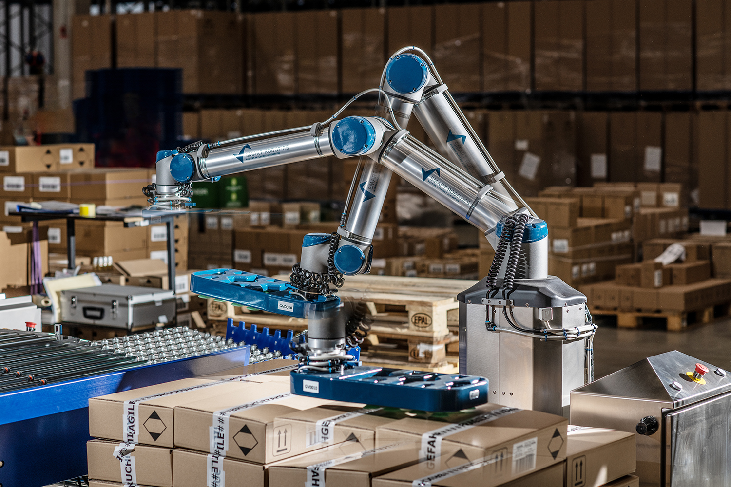 Teilautomatisierung: CoBots unterstützen beim Palettieren in Muggensturm, in Edelstal laufen die Transportwege wie auch die Versandfertigung der kommissionierten Paletten automatisiert.
